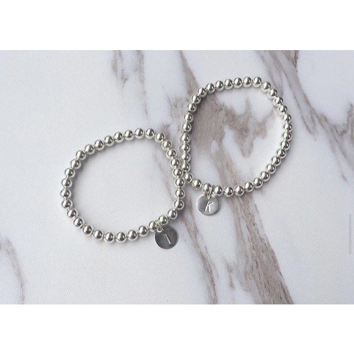 925純銀珠配手捶純銀字母牌手鏈 925 silver and hand-hammed initial charm bracelet - 手捶 925銀 8mm/10mm 字母小圓牌 (字母高3mm) hand-hammed 925 silver 8mm initial charm bracelet - 可選5mm銀珠配10mm銀牌 (字母高3mm) 5mm beads and 10mm charm available - 彈力線設計, 方便除戴 Elastic wire, easy to wear *請在備註留言所選字母 - Please leave your chosen initial in the remarks
